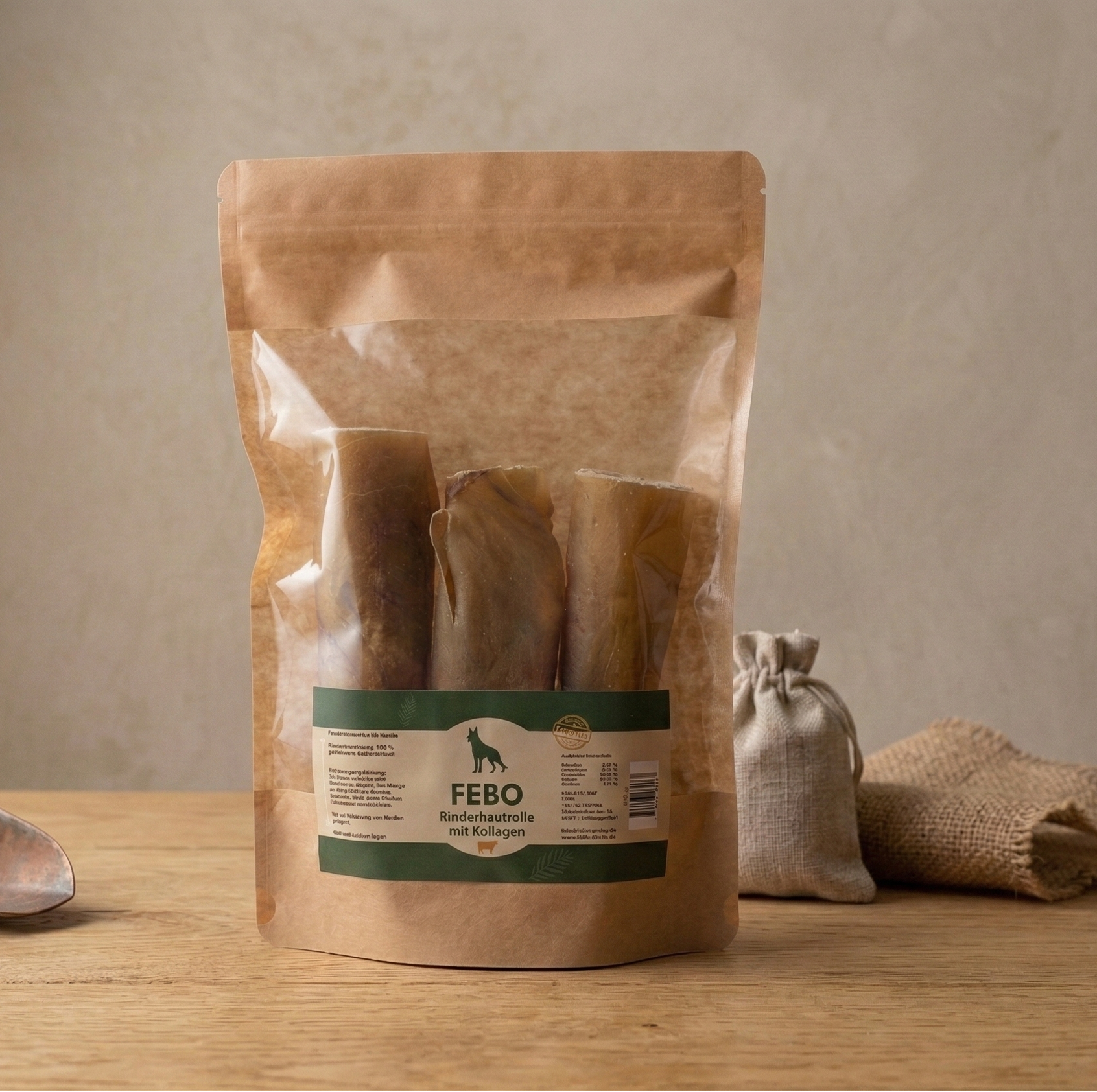 - Zusammensetzung: 100 % getrocknete Rinderhaut mit natürlichem Kollagen
